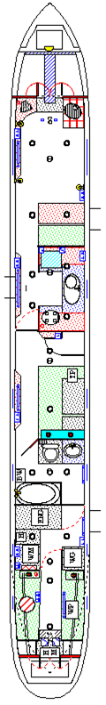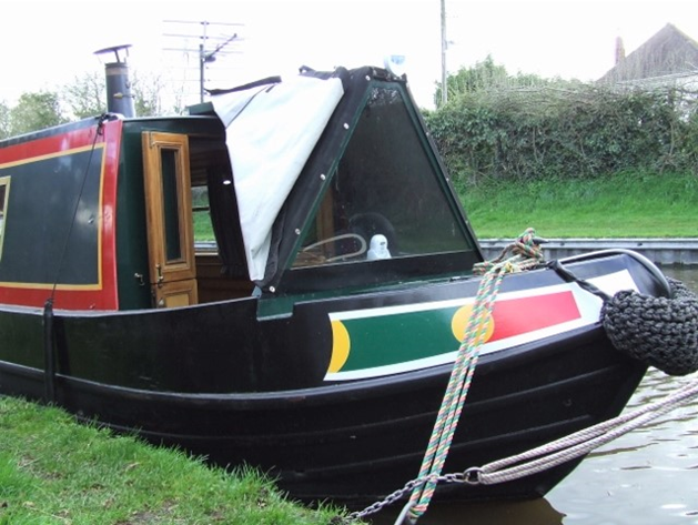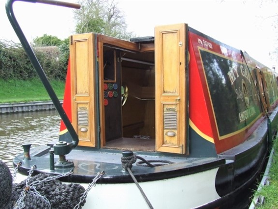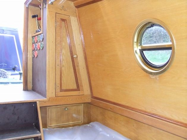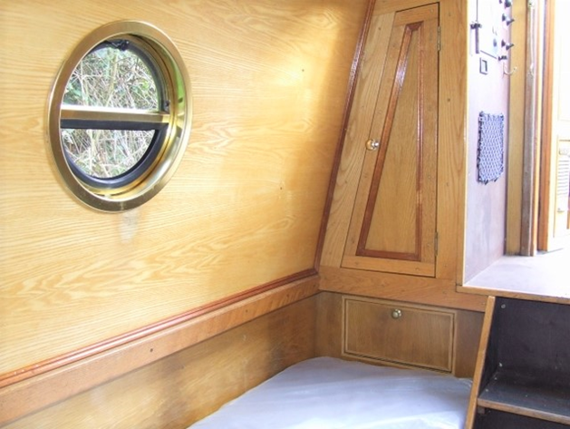 Back Cabin – The back cabin has 2 seats/beds which can also convert to a double bed. There is a small centrally mounted removable table. A panel radiator and 230V sockets are mounted below the seats. The water pump is under the starboard side bed and the hot water tank is under the port side bed. There are shelves with reading lights mounted under above the bed heads and a radio/CD player is fitted on the port side. The opening portholes are of a traditional size and fitted both sides. There are cupboards and access panels at the rear.