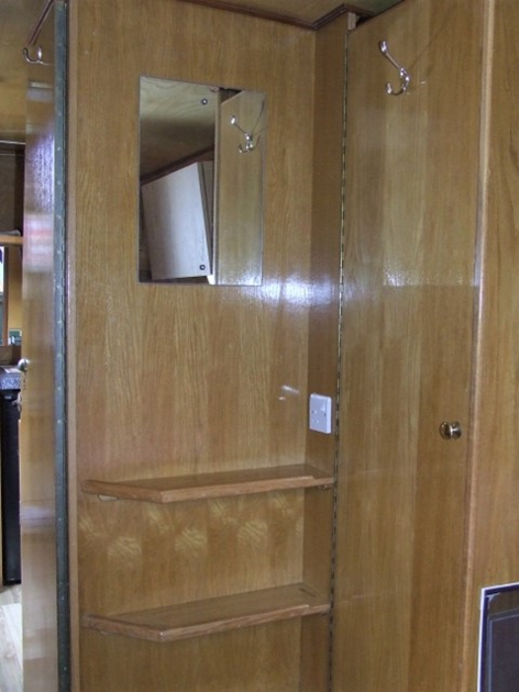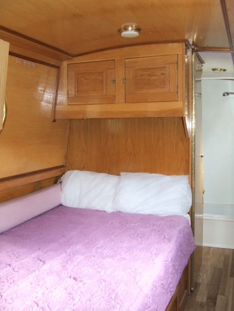 Master bedroom – To the starboard side is a fixed 6ft 3in long double bed which can have its width increased from 4ft up to 4ft 6in. There is good under bed storage. A cupboard unit with reading lights under is fitted over the bedhead. A full height wardrobe with shelves is located at the foot of the bed. Additional shelving is built onto the forward bulkhead by the wardrobe for extra storage. There are 230v ac power sockets. Large opening portholes on port and starboard side. A panel radiator is fitted on the port side with shelving around it.