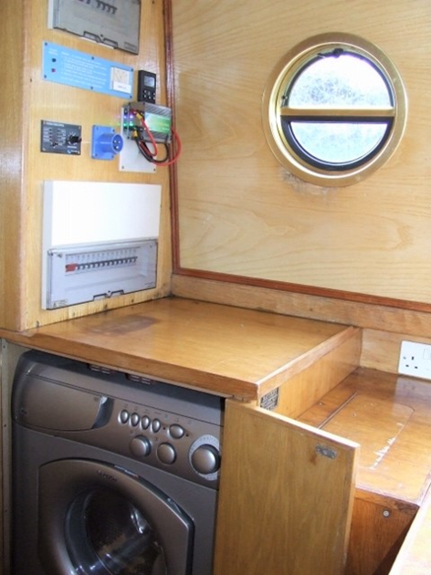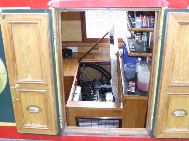 Engine Room – The engine room has custom made units enclosing the four cylinder Barrus Shire water cooled diesel engine with ‘ARS’ Hydraulic drive system, Eberspächer central heating boiler & washing machine. These units are designed to allow full maintenance by utilizing removable panels & soundproofing as required. There are several storage shelves above the engine compartment. Side doors are fitted in both cabin sides.