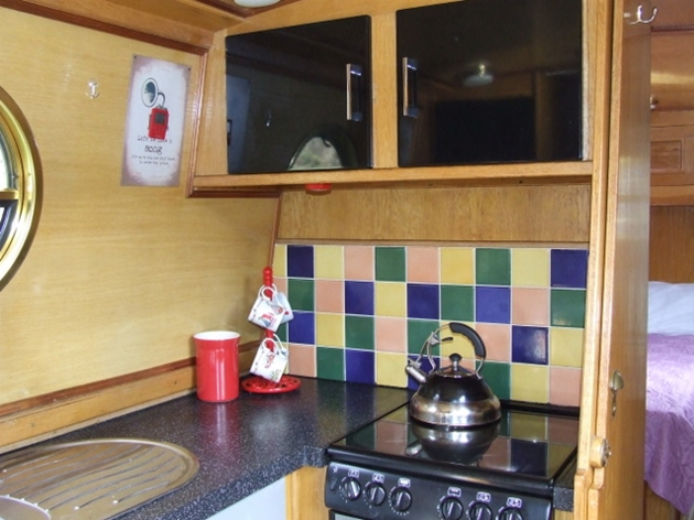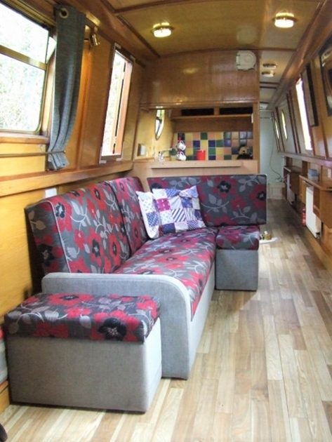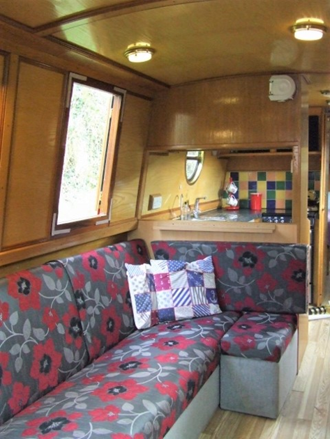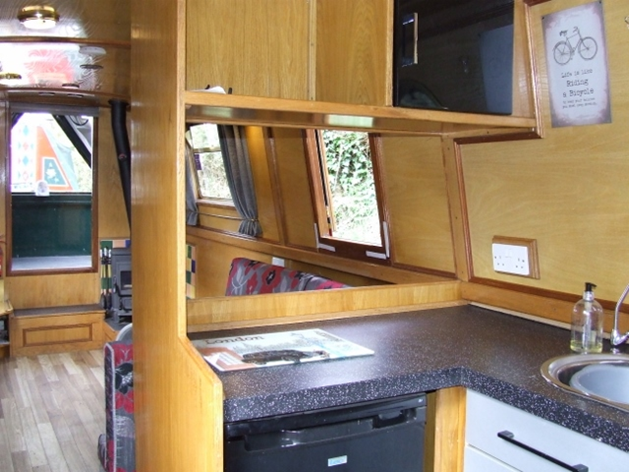 Saloon – Steel stable type front doors, have varnished timber linings, which lead into a large saloon, the step has storage underneath. On the port side is a long low level shelf unit. On the starboard side is a Morso ‘Squirrel’ solid fuel stove with a coloured tile surround on a black tile base. Heating is also supplied by a low wall mounted radiator on the port side. There is a large upholstered ‘L-shaped settee. There are electrical sockets on both sides as well as a 12V socket on the front shelf. Plenty of roof lights and wall lights are fitted. Full size windows either side and side doors to the starboard side. Floors throughout the whole boat are ‘Amtico’ wood effect flooring.