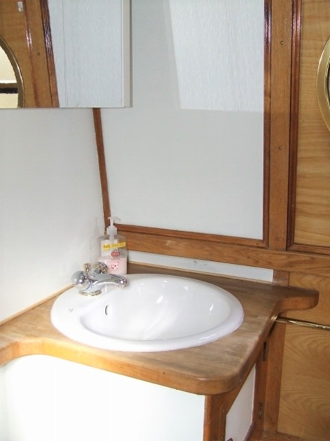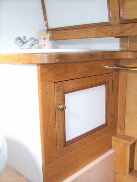 Bathroom – The bathroom is a staggered walk through style. It has a 4ft bath with shower above and surrounding curtain, a vanity unit with wash basin and a Sealand traveller type pump out toilet with a 70 gallon holding tank, and a separate flushing water tank (these go under the main bed). The windows are again opening portholes with obscured glass.