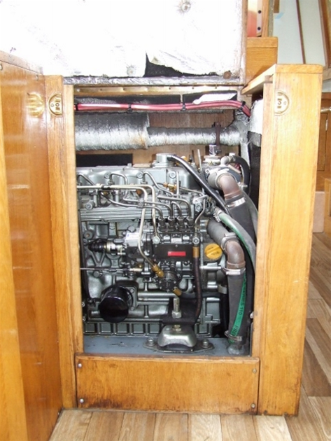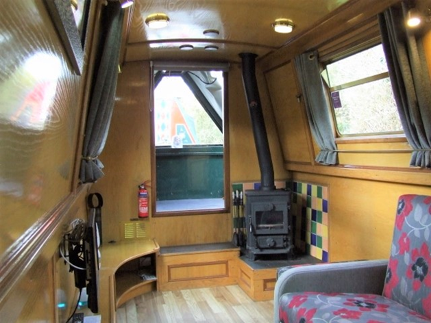 Engine room with Barrus Shire engine. ARS Hydraulic propulsion system. Large open saloon with Squirrel solid fuel stove .